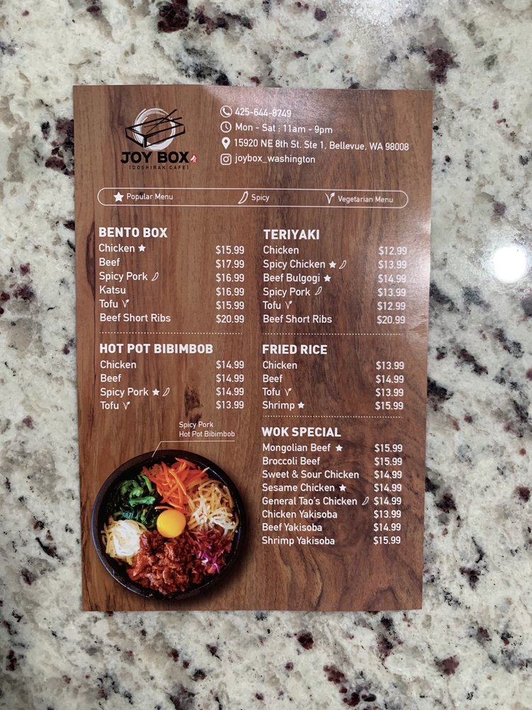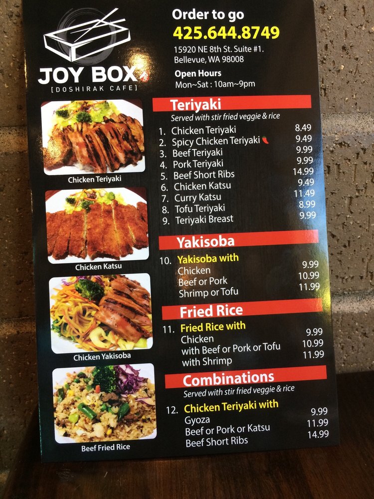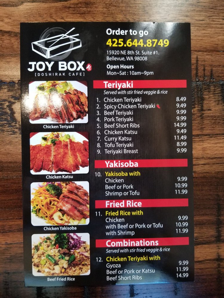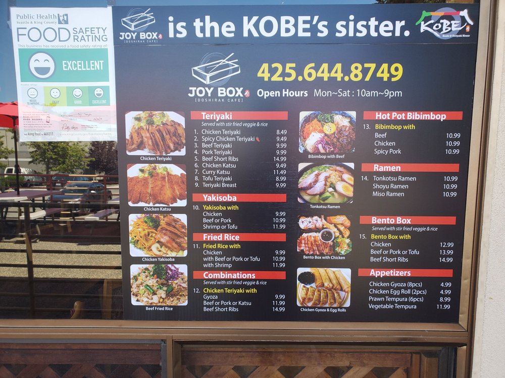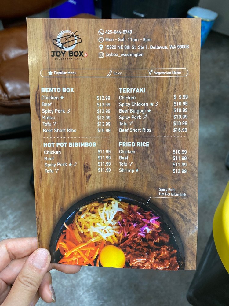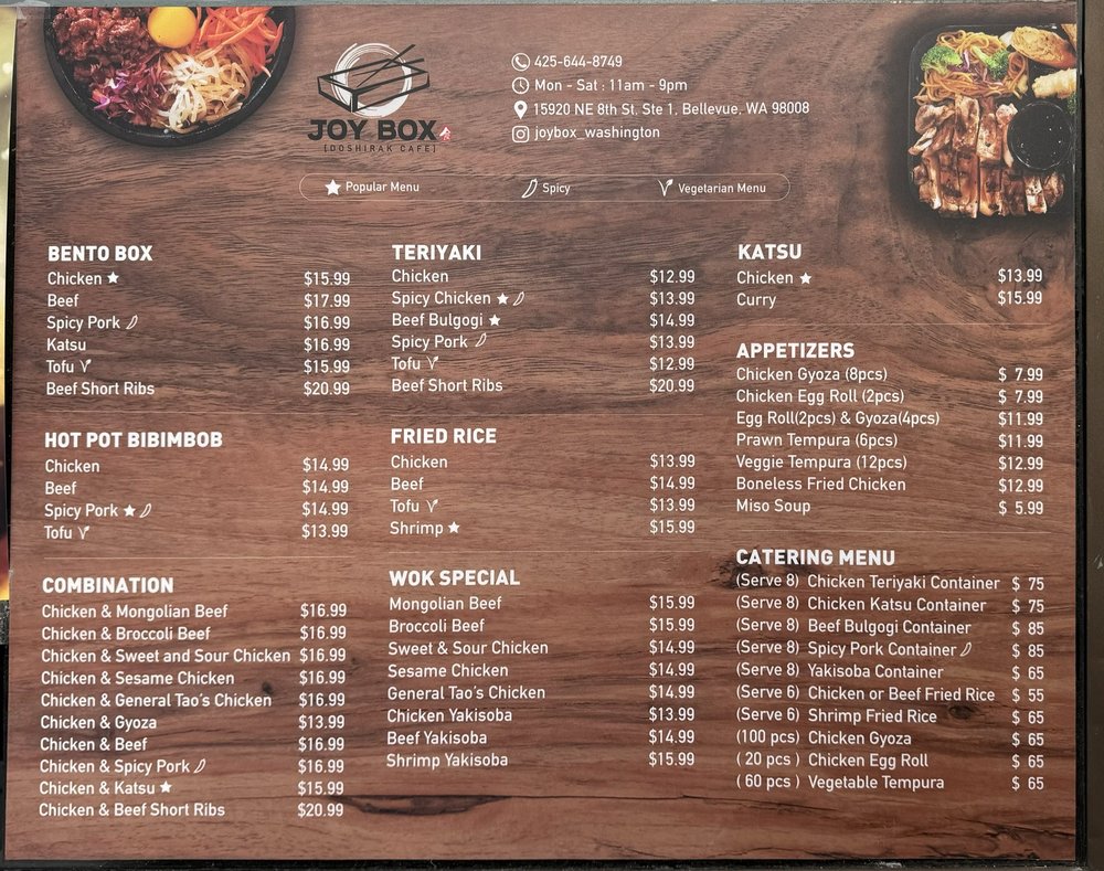 Welcome to Joy Box Restaurant, where Japanese and Korean flavors unite in a delightful dining experience. Located in Bellevue, WA, this culinary gem offers an enticing menu that showcases both traditional and contemporary dishes. From crispy prawn tempura and hearty gyoza to flavorful combo boxes such as the Chicken Katsu and Beef Short Ribs, every dish is crafted with care and attention to detail.